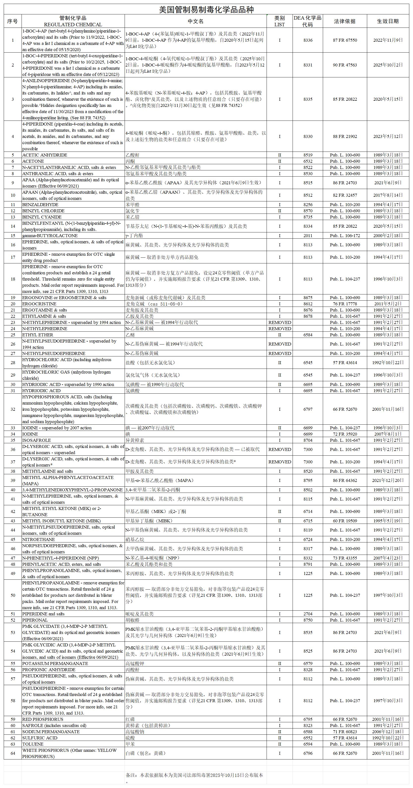 美国管制易制毒化学品品种